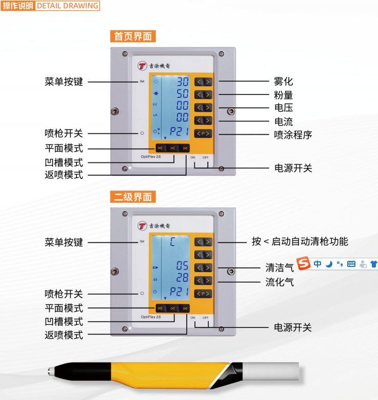 1.optistanx2S 靜電噴槍控制器是調(diào)節(jié)所有叁數(shù)的核心,它清晰的液晶顯示屏設計幫您找到適用于任何運作條件的最佳設置。確認工藝參數(shù),系統(tǒng)參數(shù),工藝數(shù)值。查看狀態(tài),并可調(diào)節(jié)電壓氣量。
