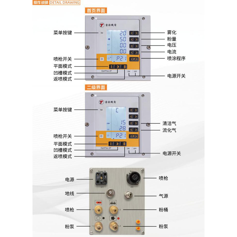3.OptiStanx2F靜電粉末噴槍控制器是最新設(shè)計開發(fā)的新-代靜電粉末噴槍控制器??捎糜谑謩雍妥詣訃姌尩目刂?。該控制器一方面預(yù)存有三個標(biāo)準(zhǔn)程序,專門用于噴涂平板工件,復(fù)雜工件和返噴工件。另一方面使用者也可以通過觸摸鍵方便精確的控制電壓,噴涂電流,出粉量以及總氣量。并且可以存儲23個噴涂程序。